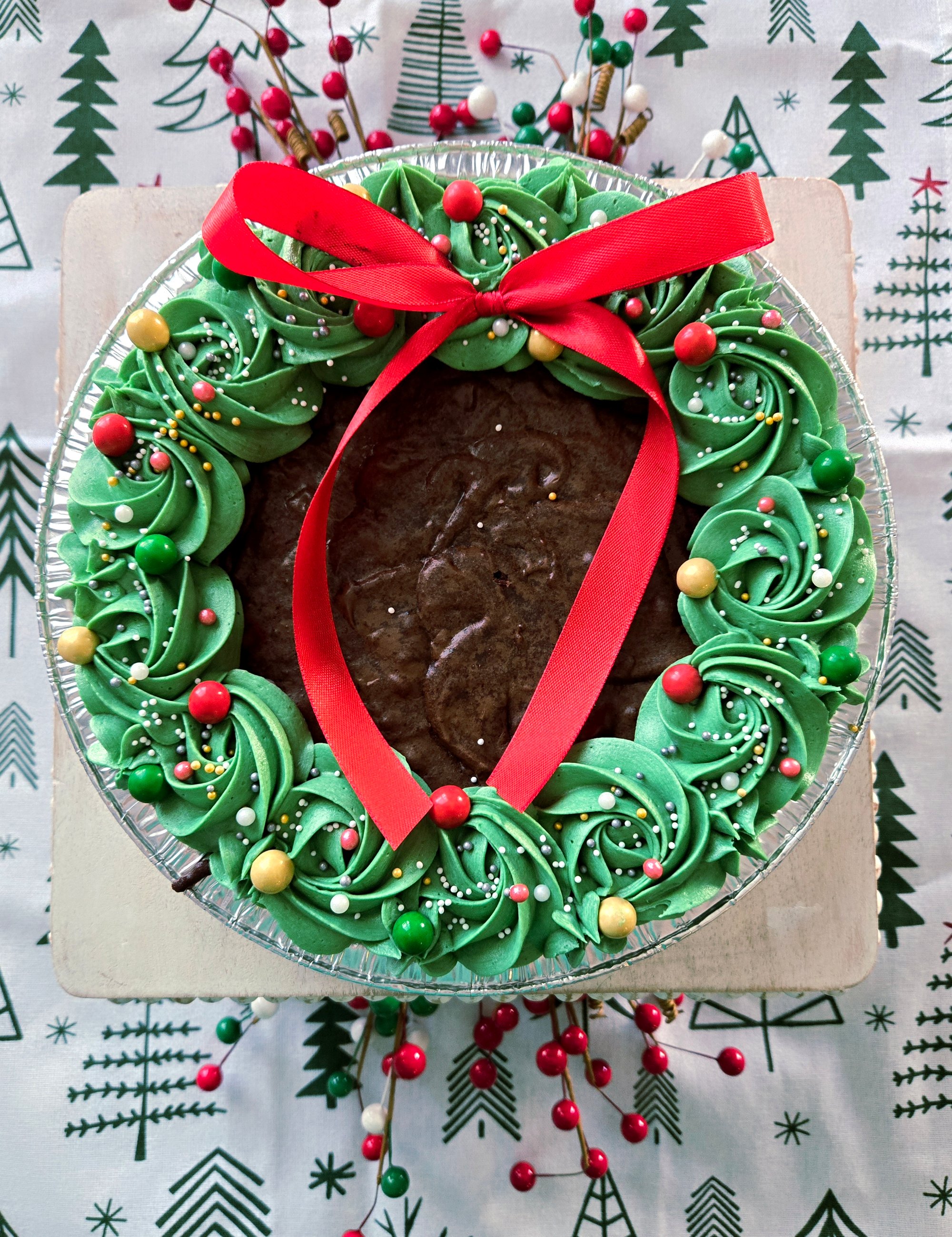 My delicious fudgy brownies will come baked in an 8 inch tin and decorated like shown!! Another fabulous option for a party centerpiece!! Topped with vanilla buttercream and a non edible satin bow. Will come with tag and ribbon. Serves 8-12 depending on how you slice.