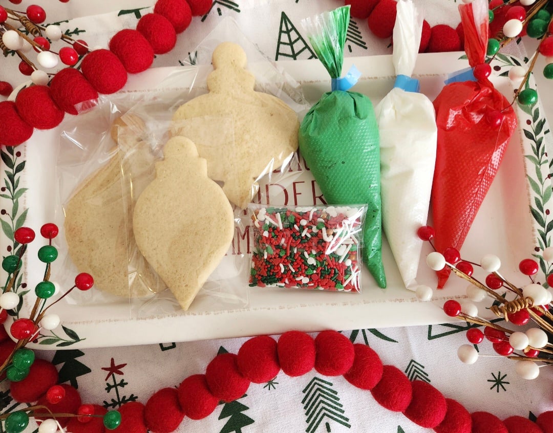 This mini decorate your own kit comes with an assortment of 3 ornament sugar cookies, 3 bags of icing and a small bag of sprinkles. Sprinkles will vary depending upon what's available. Cookies will come heat sealed in a box with instructions.