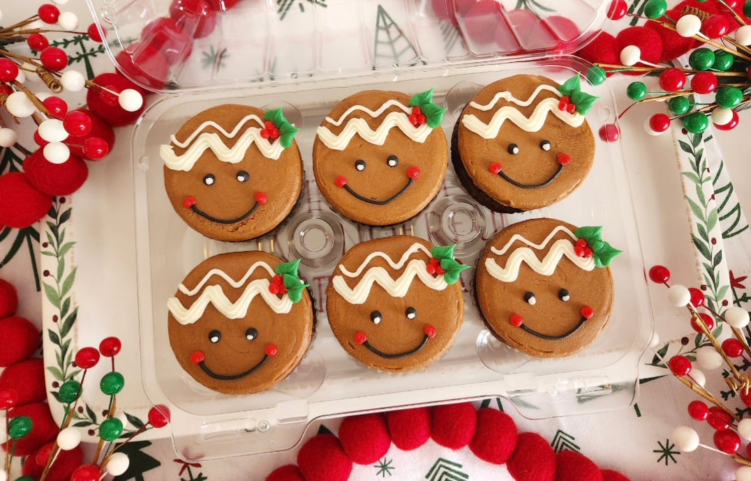 These cuties are perfect for you gingerbread lovers!! 6 gingerbread spiced cupcakes topped with a cream cheese buttercream and decorated like shown! Cupcakes will come with a tag and ribbon.