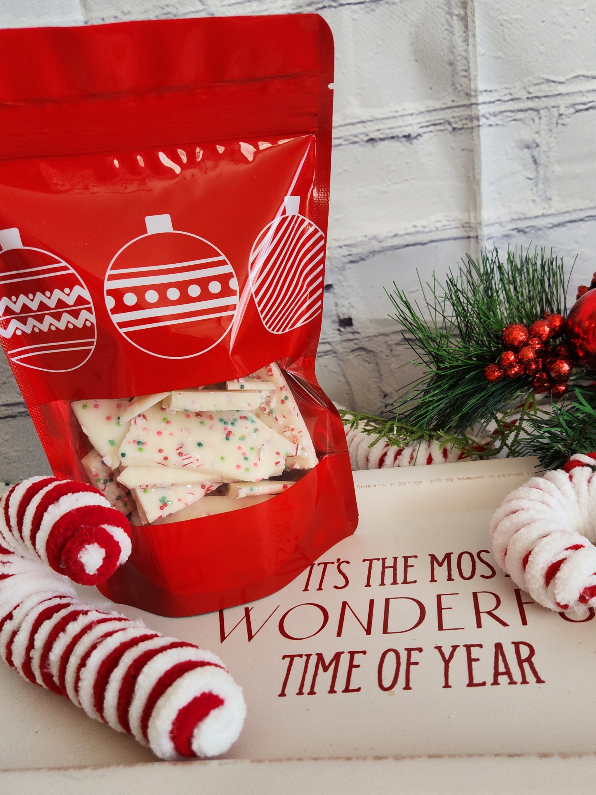 5 oz of white chocolate peppermint bark will come heat sealed in a festive pouch. Pouch design will vary.